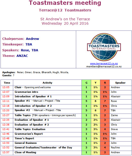 Toastmasters meeting 19th April – ANZAC