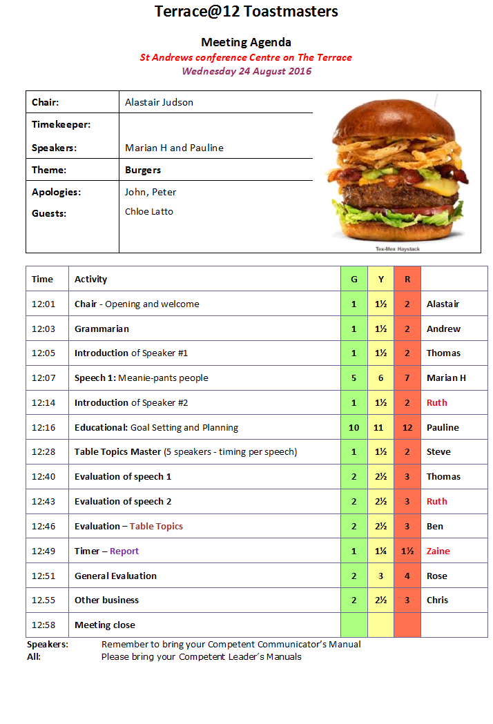 Toastmasters Meeting 24 August – Burgers